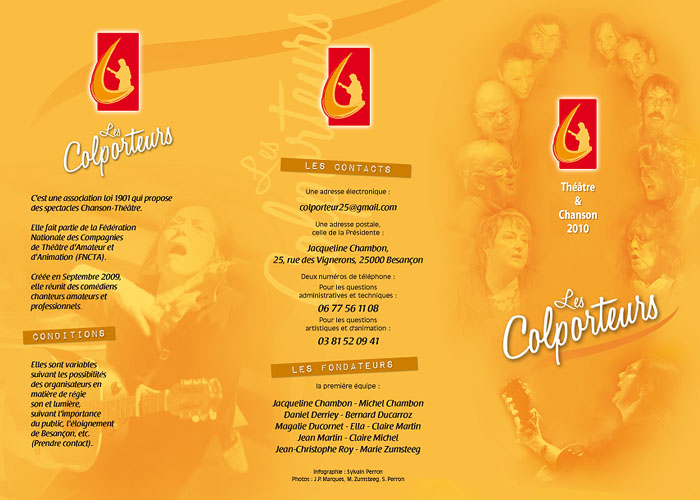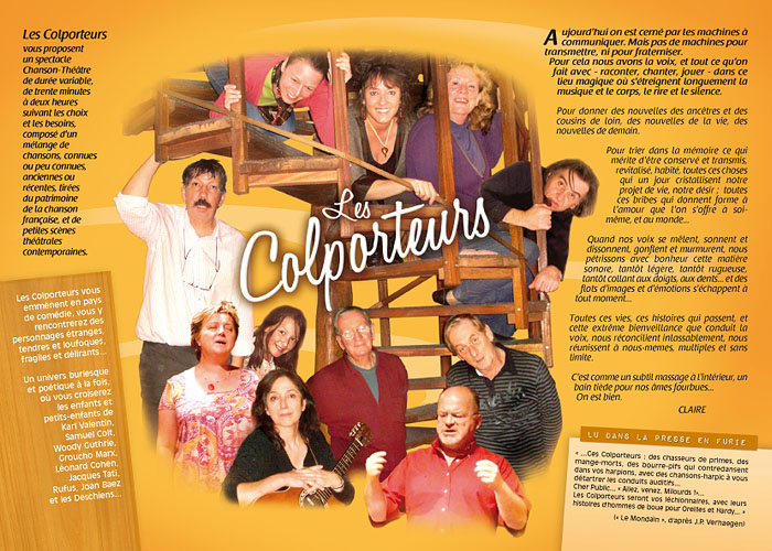 Les Colporteurs vous proposent un spectacle Chanson-Théâtre de durée variable, de trente minutes à deux heures suivant les choix et les besoins, composé d'un mélange de chansons, connues ou peu connues, anciennes ou récentes, tirées du patrimoine de la chanson française, et de petites scènes théâtrales contemporaines.
