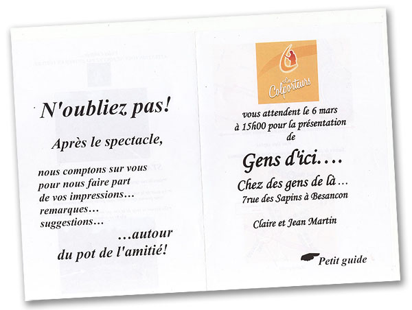 Les Colporteurs vous emmènent en pays de comédie, vous y rencontrerez des personnages étranges, tendres et loufoques, fragiles et délirants...